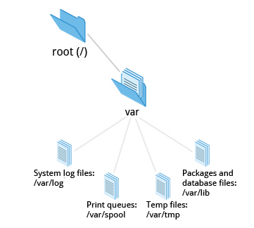 • The /var directory contains files that are expected to change in size and content as the system is running (var stands for variable), such as the entries in the following directories: