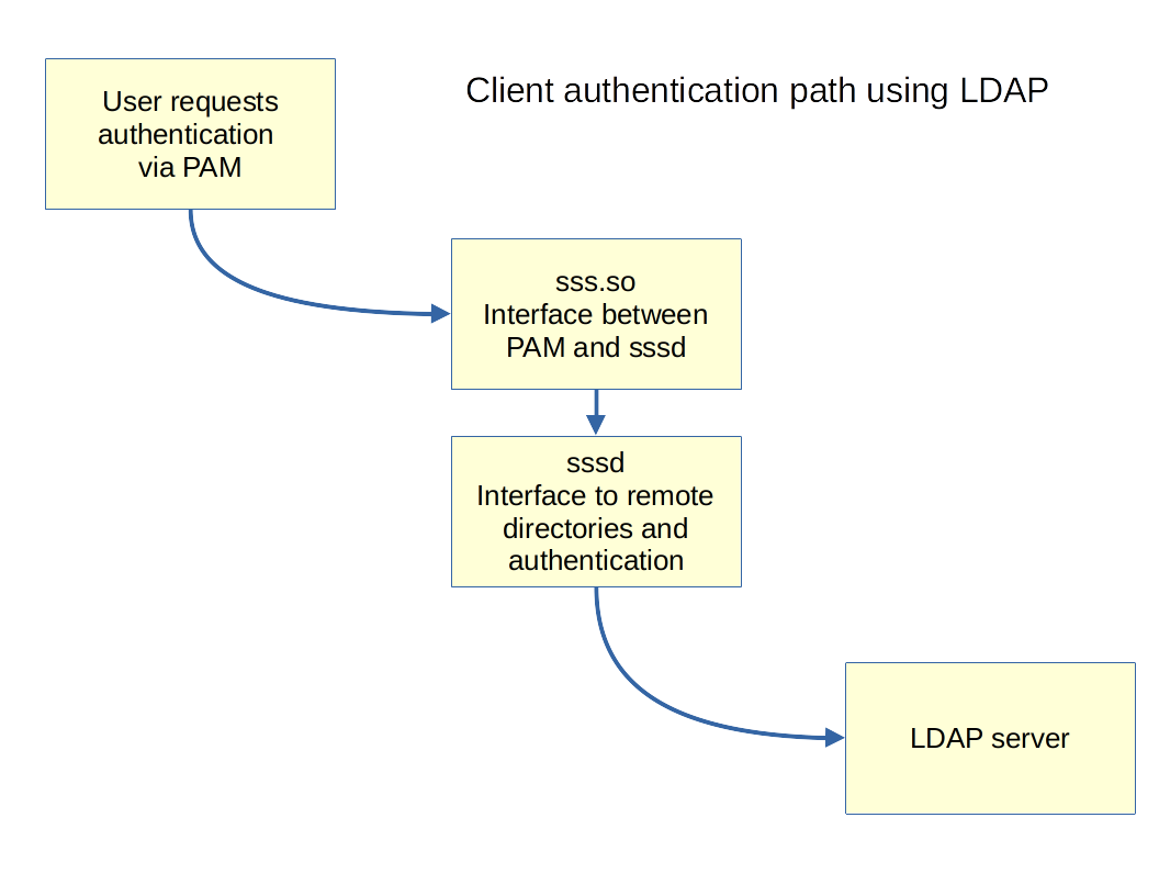 The graphic shows the information path used by LDAP/SSSD. Connecting to an LDAP server starts with PAM, the pluggable authentication module.