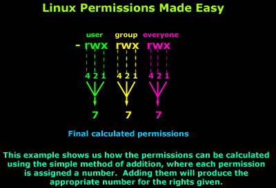 • This kind of syntax can be difficult to type and remember, so one often uses a shorthand which lets you set all the permissions in one step. This is done with a simple algorithm, and a single digit suffices to specify all three permission bits for each entity. This digit is the sum of: